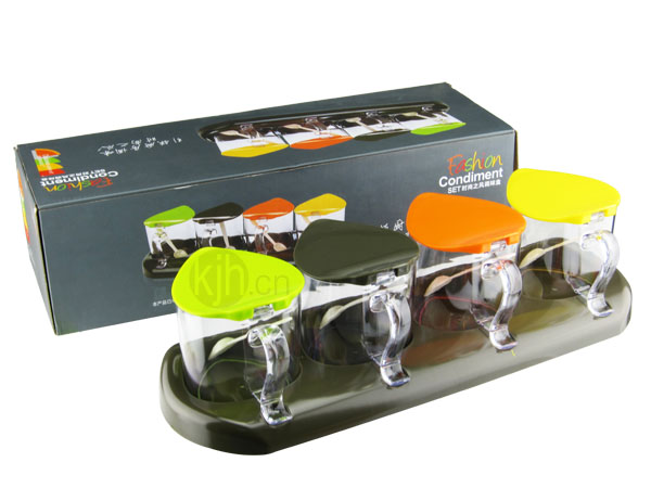 - 本產(chǎn)品采用食品級(jí)材料制作,安全、環(huán)保、無(wú)毒。套裝盒底部固定式底座設(shè)計(jì),有效固定調(diào)味盒之余,整理方便,更實(shí)用。