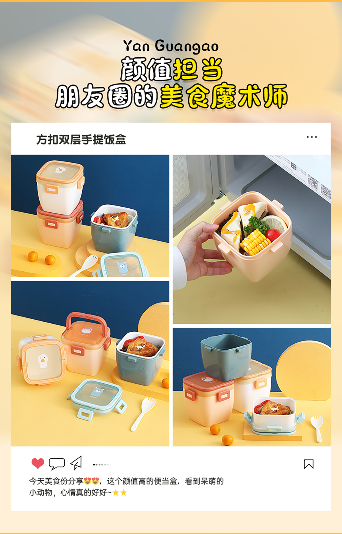 卡通方扣雙層手提飯盒800ml