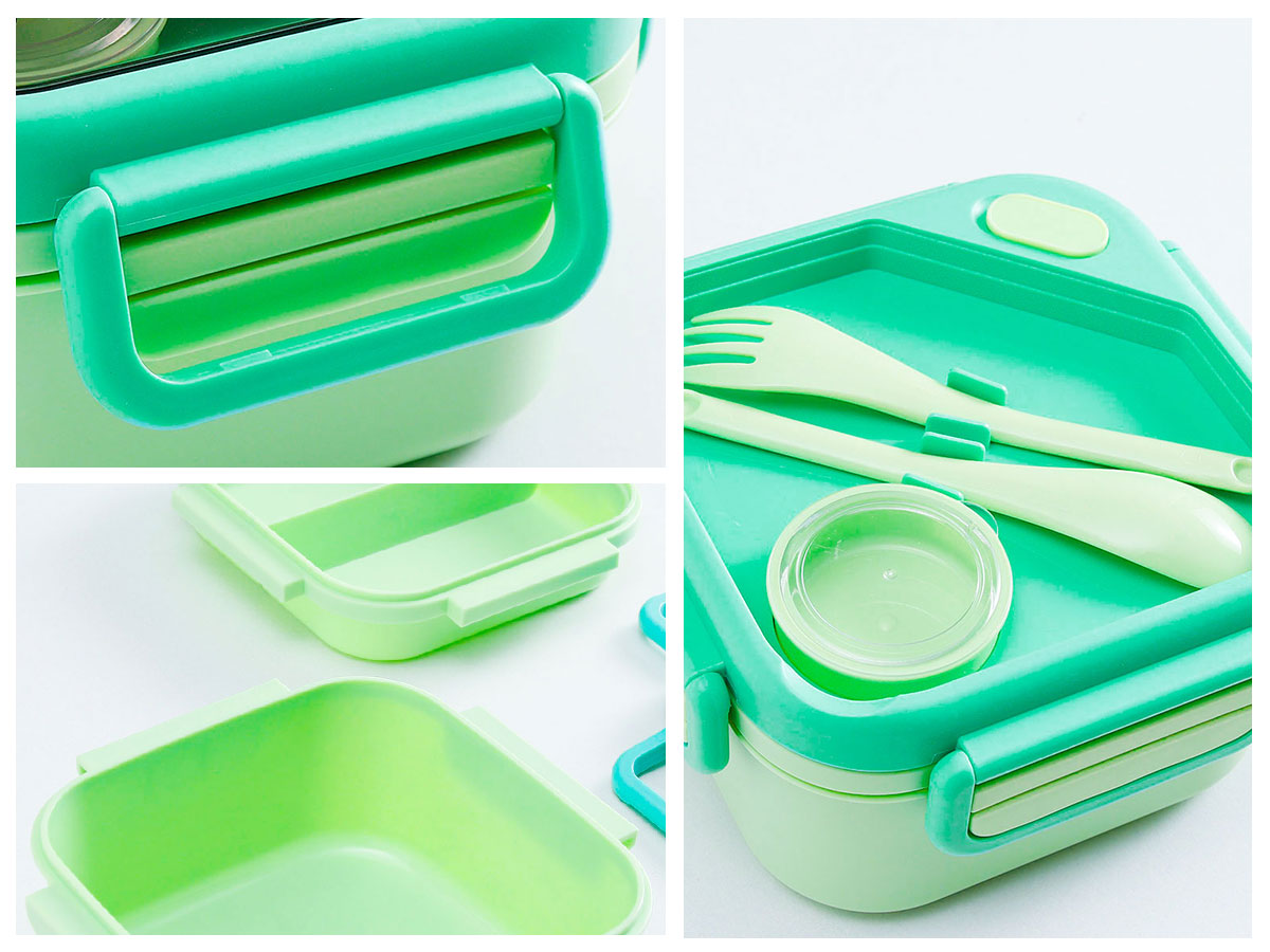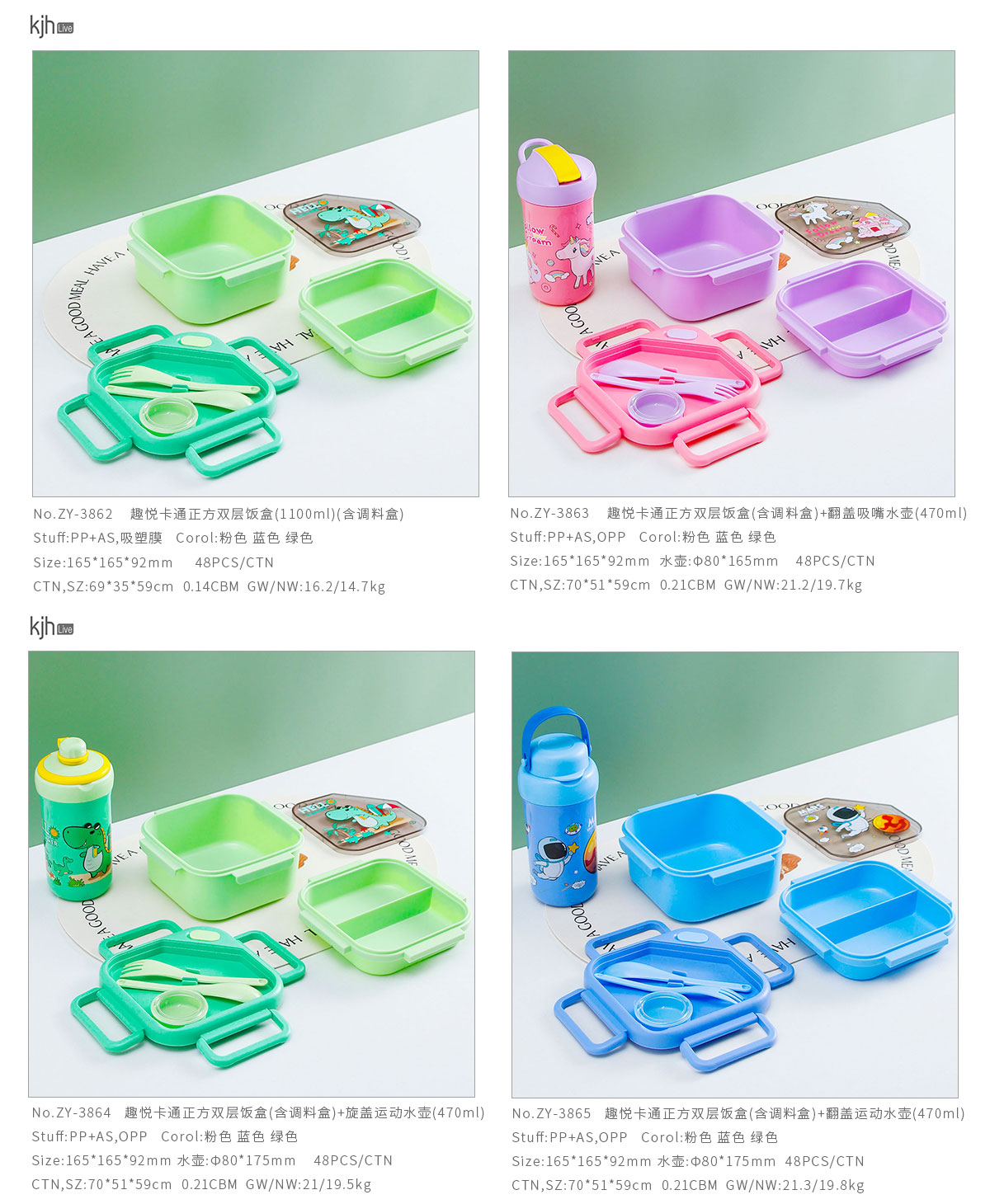 趣悅卡通正方雙層飯盒(含調料盒)+翻蓋吸嘴/旋蓋運動/翻蓋運動水壺