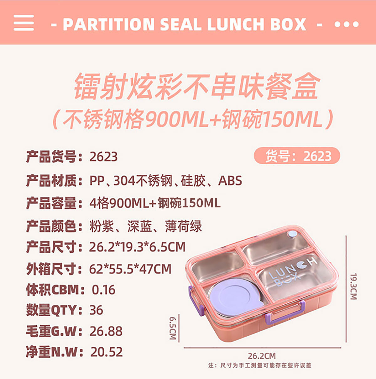 AQX-2623:262*193*65mm/不銹鋼4格900ml+鋼碗150ml