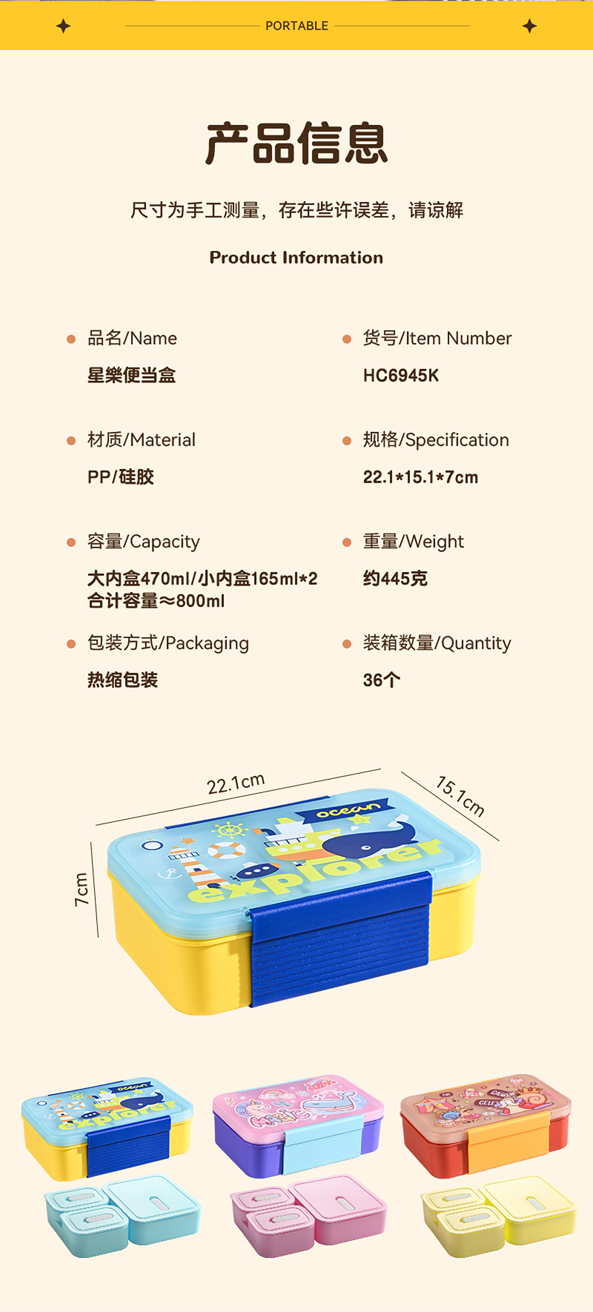 Size: 221*151*70mm/大內盒470ml/小內盒165ml*2